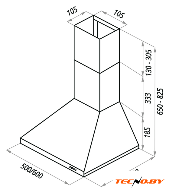 Освещение рабочей зоны обеспечивают две лампы накаливания мощностью 80 Вт, что создаст комфортные условия для приготовления пищи даже в вечернее время. Ширина вытяжки составляет 50 см, глубина — 50 см, а высота варьируется от 65 до 82,5 см, позволяя настроить ее по своему усмотрению. Диаметр воздуховода — 100 мм, что обеспечивает легкость установки и подключения.