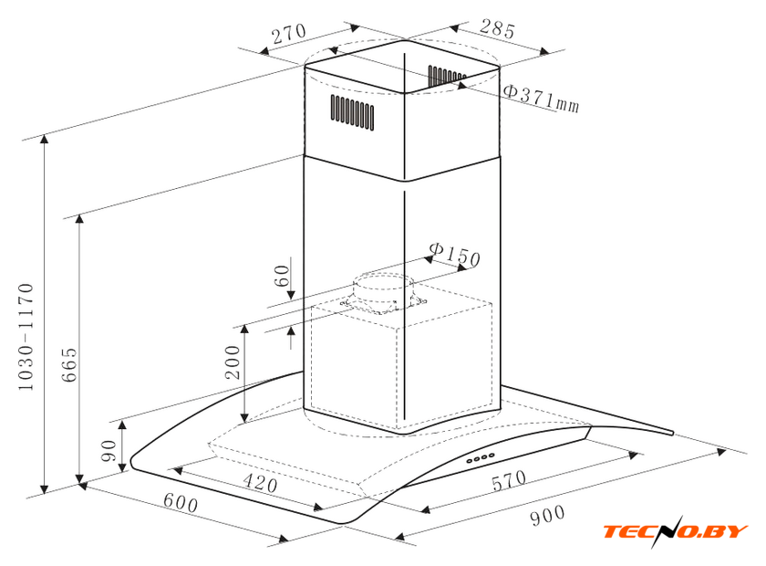 Эта вытяжка имеет ширину 90 см и глубину 60 см, что позволяет ей идеально вписаться в стандартные кухонные помещения. Высота регулируется от 103 до 117 см, что делает ее подходящей для различных высот потолков. Диаметр воздуховода в 150 мм обеспечивает эффективную циркуляцию воздуха.
