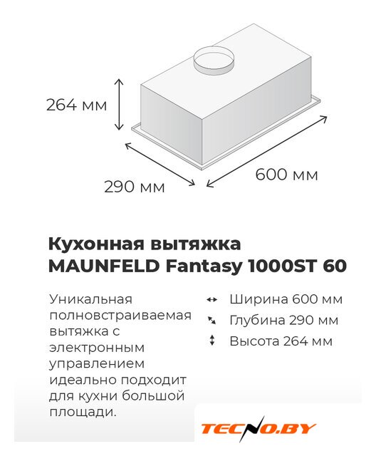 Кухонная вытяжка MAUNFELD Fantasy 1000ST 60 имеет размеры 59.8 см в ширину, 29.6 см в глубину и 16.7 см в высоту, что делает ее компактной и универсальной для большинства кухонь. Несмотря на мощную работу, уровень шума не превышает 52 дБА, что исключает дискомфорт от громкой работы прибора. Жироулавливающий фильтр из алюминия удобно чистится, а сами фильтры обеспечивают деликатную очистку воздуха. 🌬️