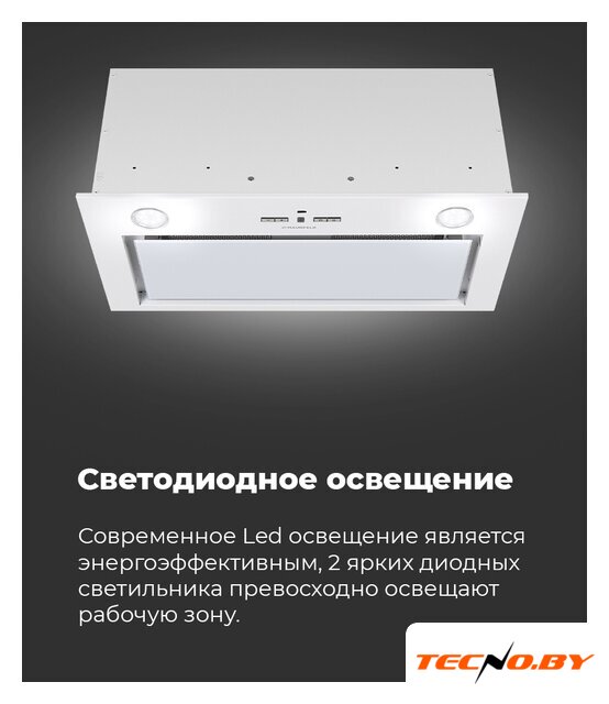 Для дополнительного комфорта на вашей кухне вытяжка оснащена двумя светодиодными лампами общей мощностью 6 Вт. Это обеспечит отличную видимость рабочей поверхности даже в темное время суток. Освещение светодиодами — это долгий срок службы и низкое энергопотребление.