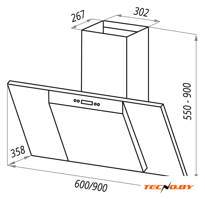 конструкция наклонная, монтаж настенный, ширина 90 см, управление сенсорное, производительность мотора 1050 м³/ч, цвет нержавеющая сталь
