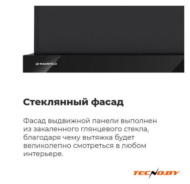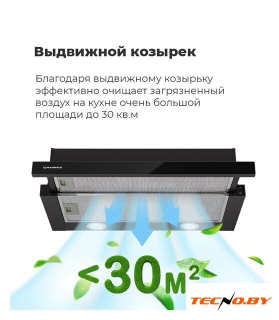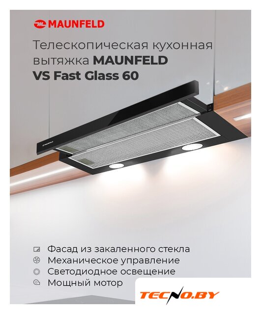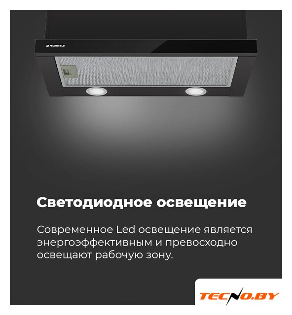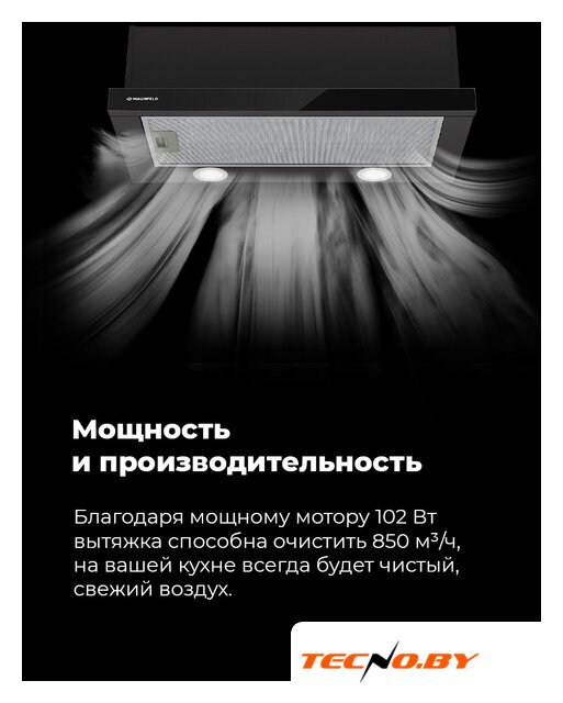 MAUNFELD VS Fast 60 оборудована встроенным мотором мощностью 100 Вт, который обеспечивает максимальную производительность до 850 куб. м/ч. Это делает вытяжку отличным выбором для средних и больших кухонь. Несмотря на высокую производительность, уровень шума мотора составляет всего 47 дБА, что позволяет сохранить тишину и комфорт в доме.