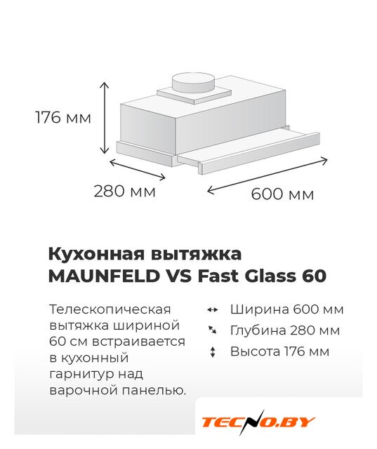 Кухонная вытяжка MAUNFELD VS Fast 60 выполнена в классическом стиле, который добавляет элегантности любой кухне. Её телескопическая конструкция предназначена для встраивания, что позволяет месту над плитой оставаться свободным и аккуратным. Благодаря нержавеющей стали, корпус устройства выглядит стильно и современно.