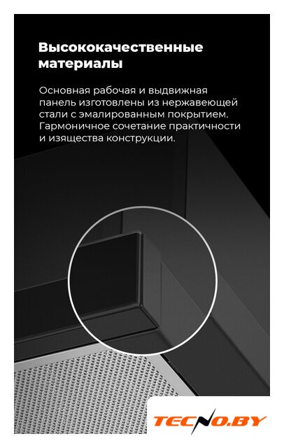 Корпус вытяжки изготовлен из прочной стали, что обеспечивает её долговечность и устойчивость к износу. Она оснащена двумя алюминиевыми жироулавливающими фильтрами, которые эффективно задерживают частицы жира, поддерживая чистоту воздуха на кухне. Угольный фильтр в комплект не входит, но его можно приобрести отдельно, если требуется дополнительная очистка воздуха.