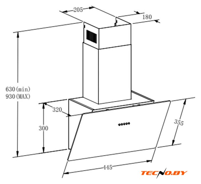 Ширина вытяжки составляет 44.5 см, глубина — 32 см, а высота варьируется от 63 до 93 см, что делает её компактной, но при этом достаточно мощной для средних кухонных помещений. Диаметр воздуховода составляет 150 мм, обеспечивая эффективное удаление воздуха.
