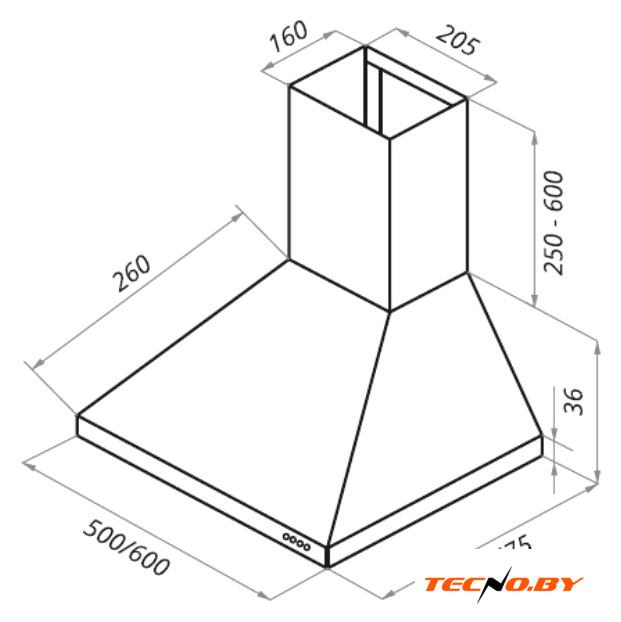 Ширина вытяжки составляет 60 см, а глубина – 47.5 см, что делает ее компактной и удобной для установки на любой кухне. Масса устройства всего 6 кг, что облегчает монтаж и эксплуатацию. Воздуховод диаметром 120 мм поможет эффективно отводить воздух из помещения.