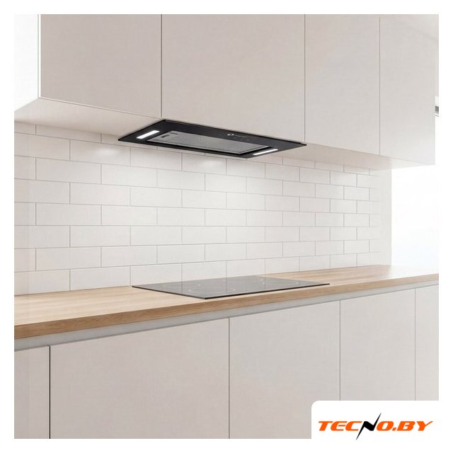 конструкция скрытая, монтаж для встраивания, ширина 59.8 см, управление сенсорное/жестами, производительность мотора 1300 м³/ч, цвет черный