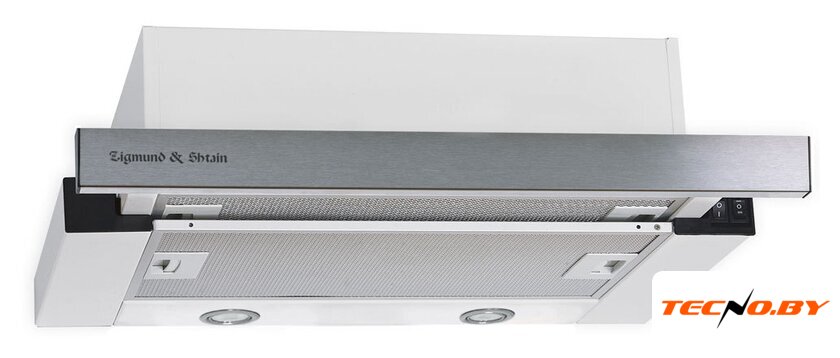 конструкция скрытая, монтаж для встраивания, ширина 52 см, управление механическое/кнопочное, производительность мотора 900 м³/ч, цвет белый