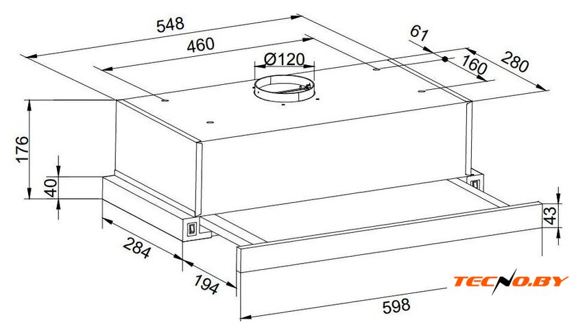 конструкция коробчатая, монтаж настенный, ширина 59 см, управление электронное/кнопочное, производительность мотора 700 м³/ч, цвет белый
