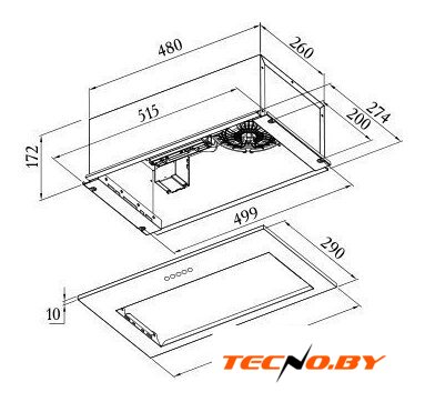 конструкция скрытая, монтаж для встраивания, ширина 53 см, управление механическое/кнопочное, производительность мотора 520 м³/ч, цвет белый