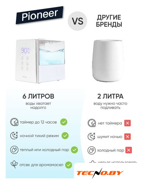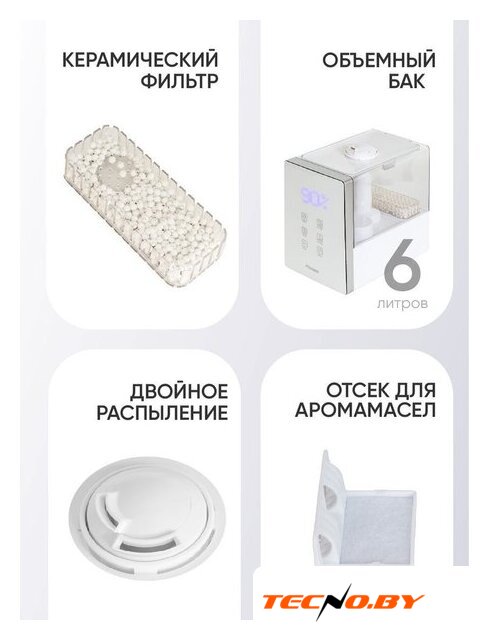 ультразвуковой, помещение до 20 м², производительность 280 мл/ч, резервуар 3.5 л, гигростат, шум 38 дБ, цвет белый/бирюзовый/прозрачный