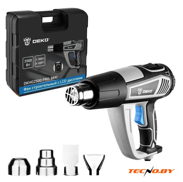 2500 Вт, 50–600 °С, 300–500 л/мин, дисплей, 0.85 кг