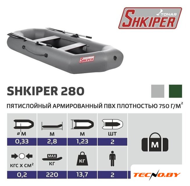 гребная лодка, дно: без настила, ПВХ 750 г/кв.м, навесной транец, грузоподъёмность: 220 кг, 2 места, 2.4x1.2 м, 13 кг
