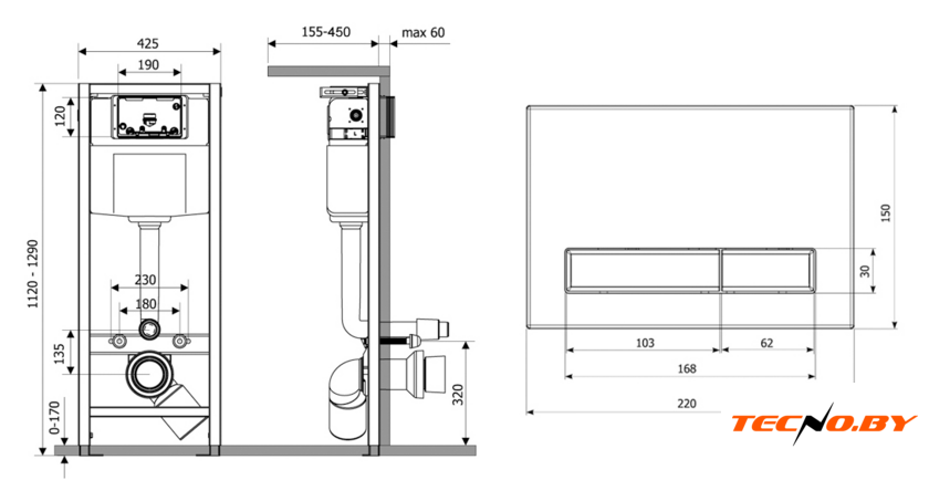 крепление на капитальную стену/на пол/на некапитальную стену, макс. нагрузка 400 кг, двухрежимный слив, механическое управление, бачок в комплекте, 42.5x129x23.5 см
