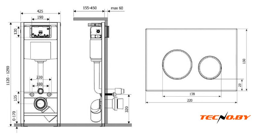 крепление на капитальную стену/на пол/на некапитальную стену, макс. нагрузка 400 кг, двухрежимный слив, механическое управление, бачок в комплекте