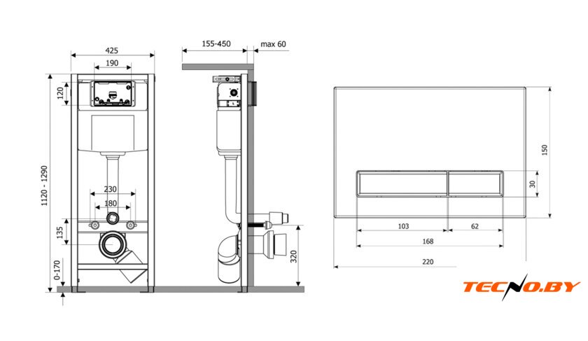 крепление на капитальную стену/на пол/на некапитальную стену, макс. нагрузка 400 кг, двухрежимный слив, механическое управление, бачок в комплекте, 42.5x129x45 см