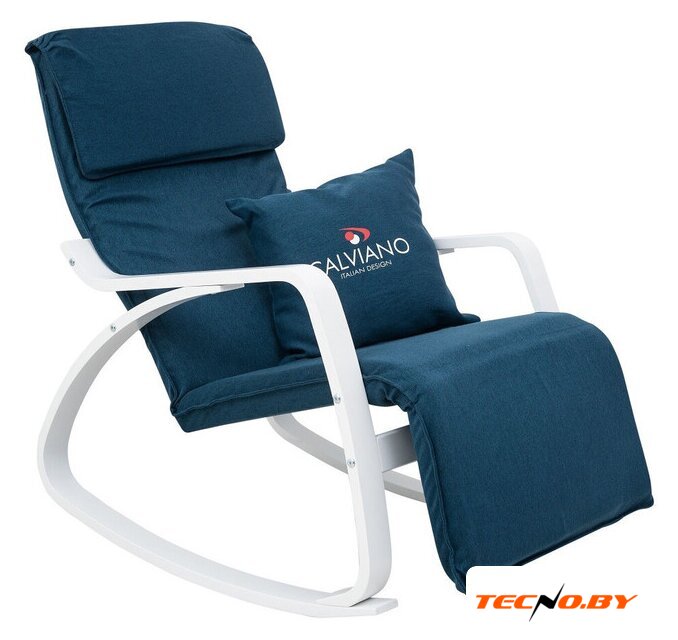 Кресло-качалка Calviano Comfort 1 выделяется своим синим сиденьем, выполненным из качественной ткани, и белым деревянным каркасом. Это сочетание придает изделию современный и стильный вид, который легко впишется в любой интерьер. Такие материалы не только эстетически привлекательны, но и практичны, обеспечивая долговечность изделия.