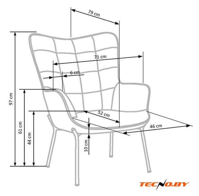 С шириной в 71 см и глубиной 79 см кресло станет идеальным акцентом как для гостиной, так и для кабинета. Высота кресла составляет 97 см, обеспечивая комфортную посадку, а высота сиденья в 44 см делает его доступным и удобным для всех возрастных групп. Глубина сиденья в 52 см способствует полному расслаблению и поддержанию правильной осанки.