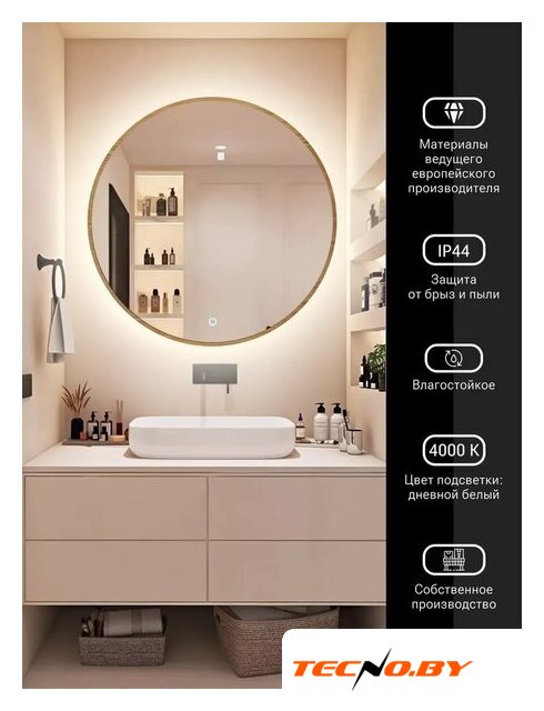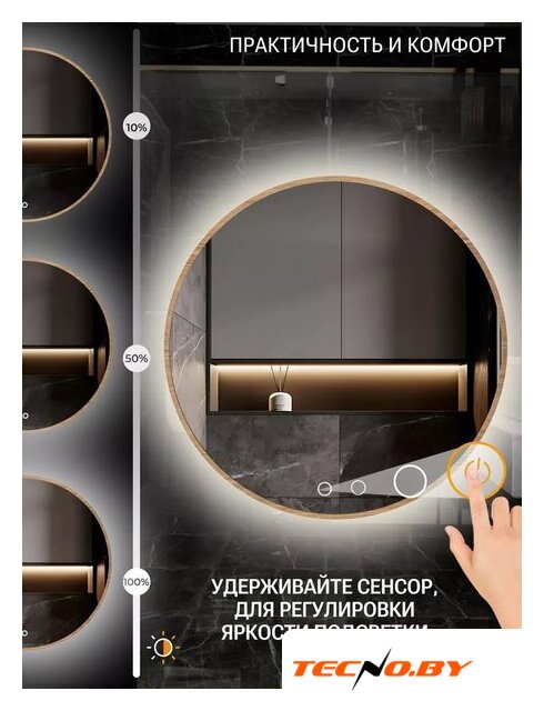 80x80 см, стекло/металл, круглая форма, установка настенная, черный, подсветка, сенсорное управление