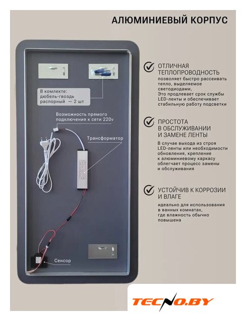| Комплектация | крепеж, подсветка, трансформатор, шнур с вилкой, дюбель-крючки (2 шт.) |
