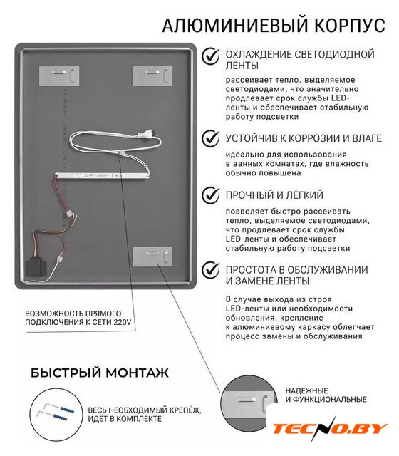 | Комплектация | подсветка, трансформатор, шнур с вилкой, система подогрева, дюбель-крючки |