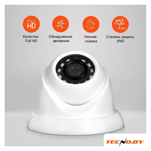 уличная проводная камера, купольная, матрица 1/2.8" CMOS, 2 МП, объектив F/1.4 3.6 мм, ИК-подсветка, интерфейс проводной, подключение микрофона, карты памяти SD
