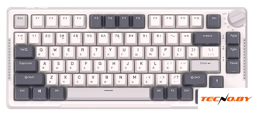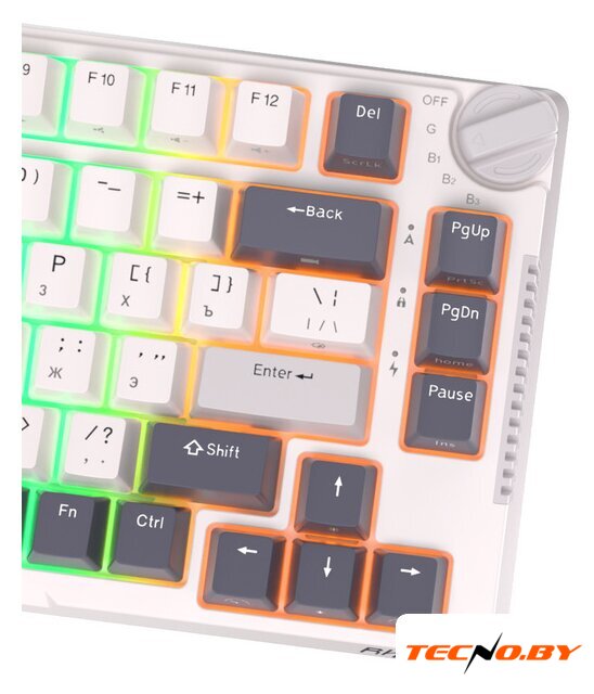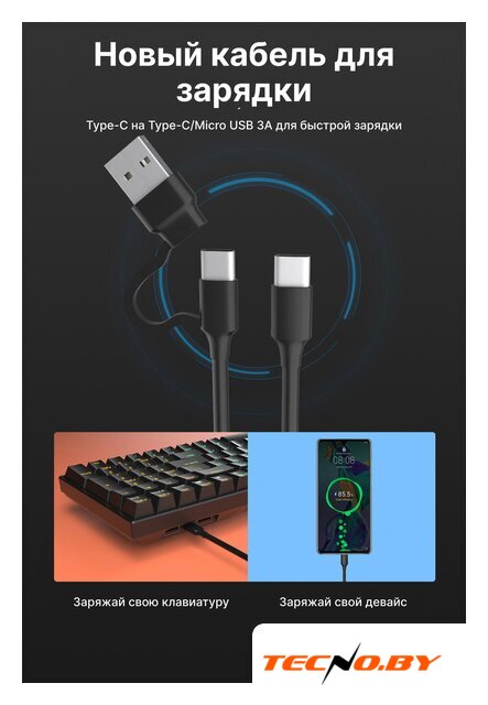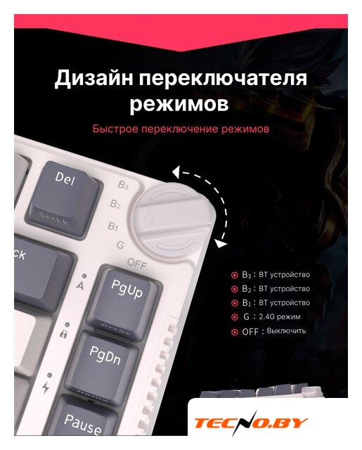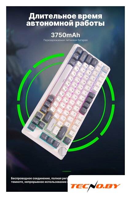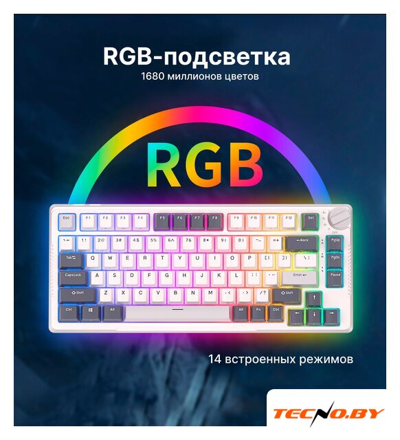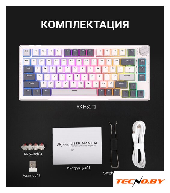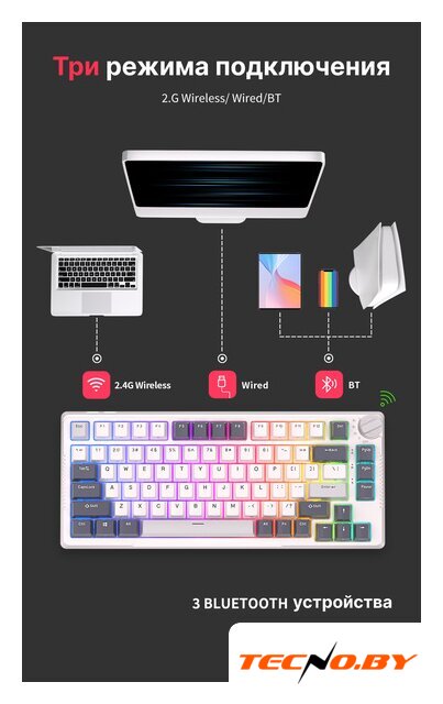 игровая для ПК/для компьютеров Apple/для iPad/для устройств Android, механическая, RK Blue, ход с кликом, пластик, интерфейс подключения - USB-A/радио/Bluetooth, подсветка, кириллица: да, USB-хаб, цвет белый/синий