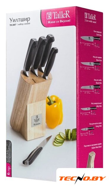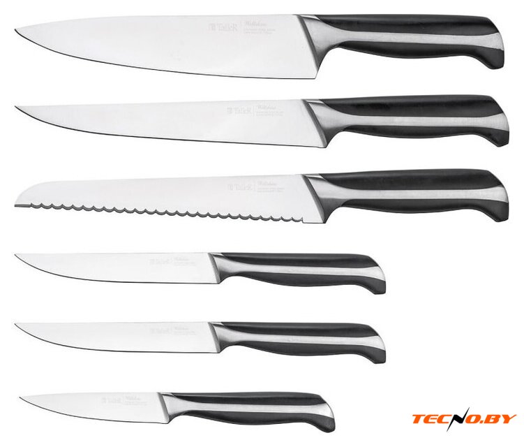 | Комплектация | - Нож поварской (лезвие 20см х 2,5мм) - 1- Нож для нарезки (лезвие 20см х 2,5мм) - 1- Нож для хлеба (лезвие 20см х 2,5мм) - 1- Нож универсальный (лезвие 12,5см х 2,0мм) - 1- Нож для чистки (лезвие 9см х 2,0мм) - 1- Подставка - 1 |