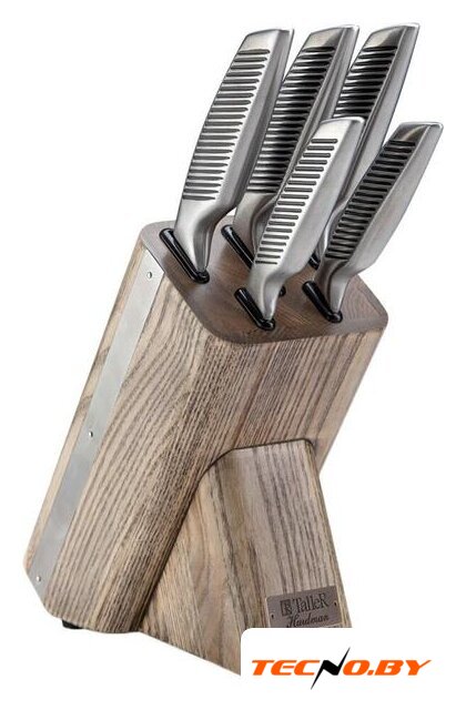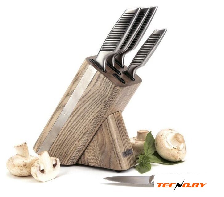 | Комплектация | - Нож поварской (лезвие 20 см х 2,5 мм) – 1 шт- Нож для нарезки (лезвие 20,5 см х 2,5 мм) – 1 шт- Нож для хлеба (лезвие 20,5 см х 2,5 мм) – 1 шт- Нож универсальный (лезвие 12 см х 1,8 мм) – 1 шт- Нож для чистки (лезвие 8 см х 1,8 мм) – 1 шт- Подставка из дерева ясеня |