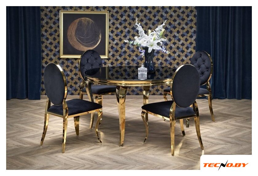Черный цвет столешницы делает его универсальным выбором, который легко сочетается с различными цветовыми палитрами и стилями интерьера. Золотые ноги добавляют акцент и делают этот стол центральным элементом любой комнаты, украшая его своим блеском и элегантностью.