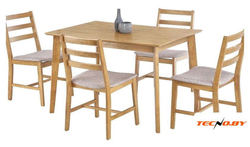 В комплекте со столом идут четыре удобных стула, каркас которых также выполнен из дерева, а сиденье облицовано мягкой тканью. Такой подход в выборе материалов и дизайна делает каждое сидение комфортным, позволяя наслаждаться долгими обедами в кругу семьи. Их классический дизайн сочетается с любой обстановкой, становясь продолжением уюта в вашем доме.