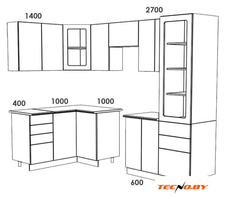 угловая, длина 270 см, ширина 140 см, каркас ЛДСП, фасад МДФ пленочный, установка мойки: врезная мойка, ширина шкафа под мойку 100 см
