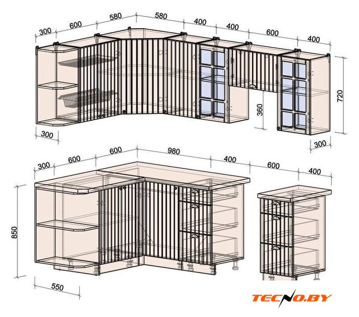 угловая, длина 300 см, ширина 120 см, каркас ЛДСП, фасад МДФ пленочный, установка мойки: врезная мойка, ширина шкафа под мойку 88 см