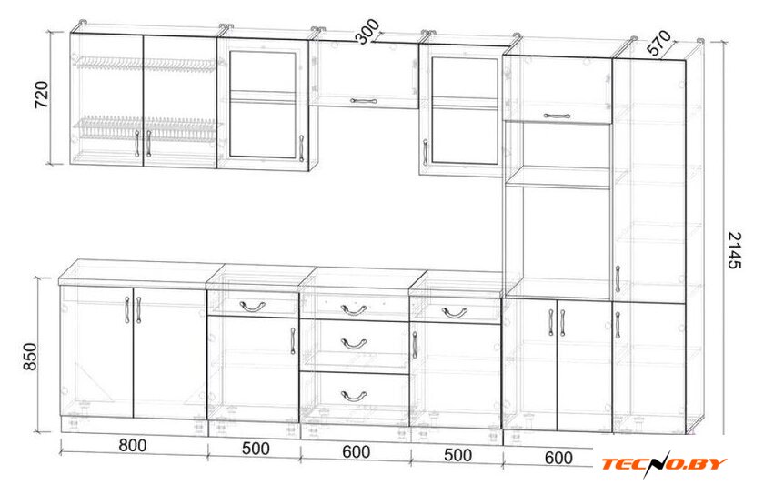 линейная, длина 270 см, ширина 60 см, каркас ЛДСП, фасад МДФ пленочный, установка мойки: врезная мойка, ширина шкафа под мойку 80 см