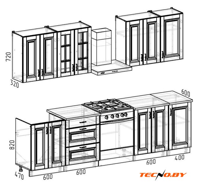 линейная, длина 260 см, ширина 60 см, каркас ЛДСП, фасад МДФ пленочный, установка мойки: накладная мойка, ширина шкафа под мойку 60 см
