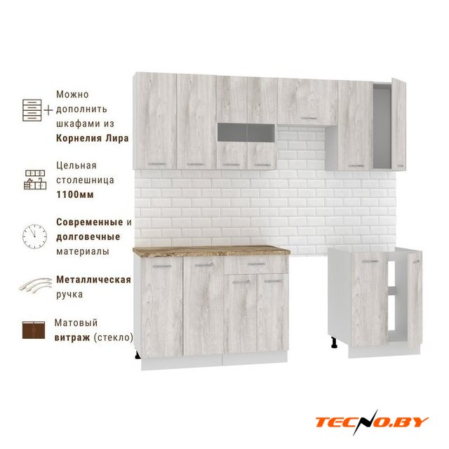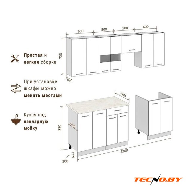 линейная, длина 220 см, ширина 60 см, каркас ЛДСП, фасад ЛДСП, установка мойки: накладная мойка, ширина шкафа под мойку 60 см