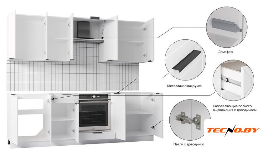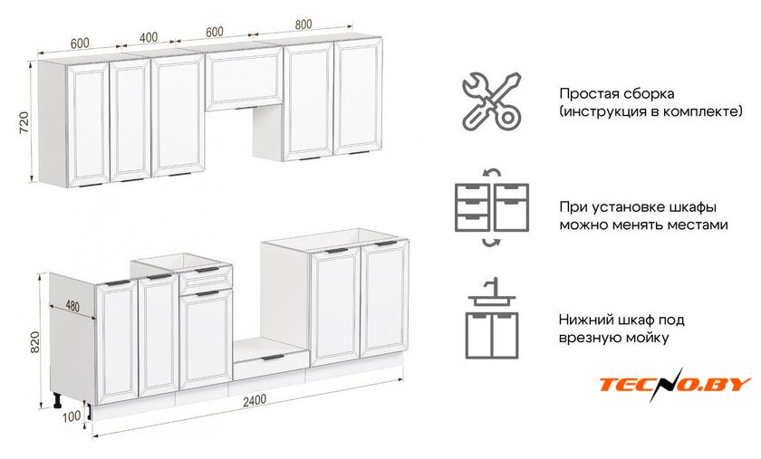 линейная, длина 240 см, ширина 47 см, каркас ЛДСП, фасад ЛДСП, установка мойки: накладная мойка, ширина шкафа под мойку 60 см