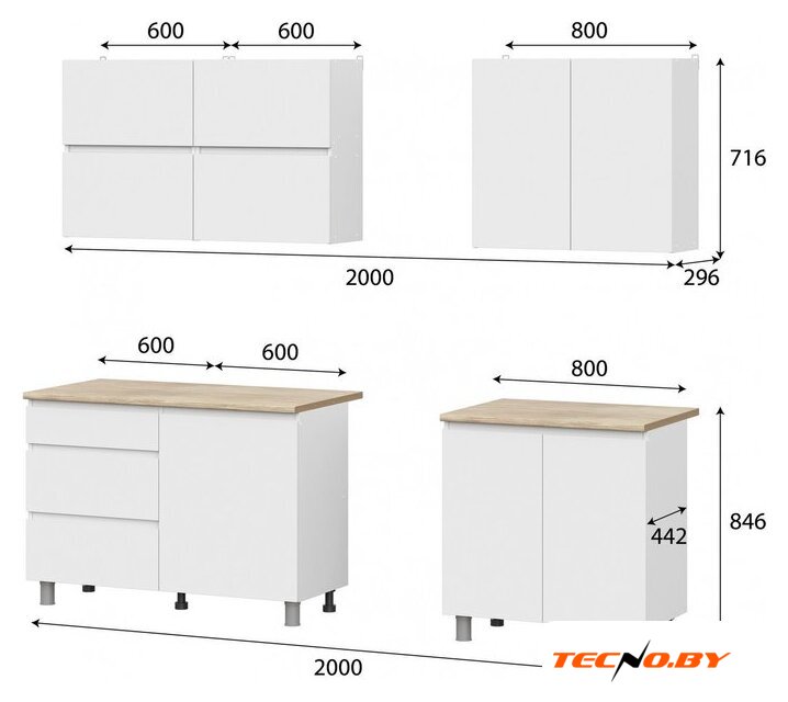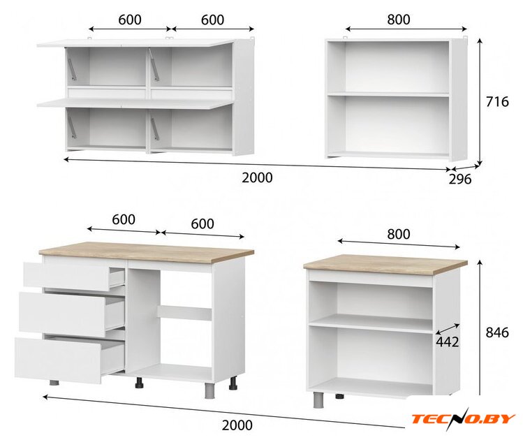 линейная, длина 200 см, ширина 60 см, каркас ЛДСП, фасад ЛДСП/постформинг, установка мойки: врезная мойка