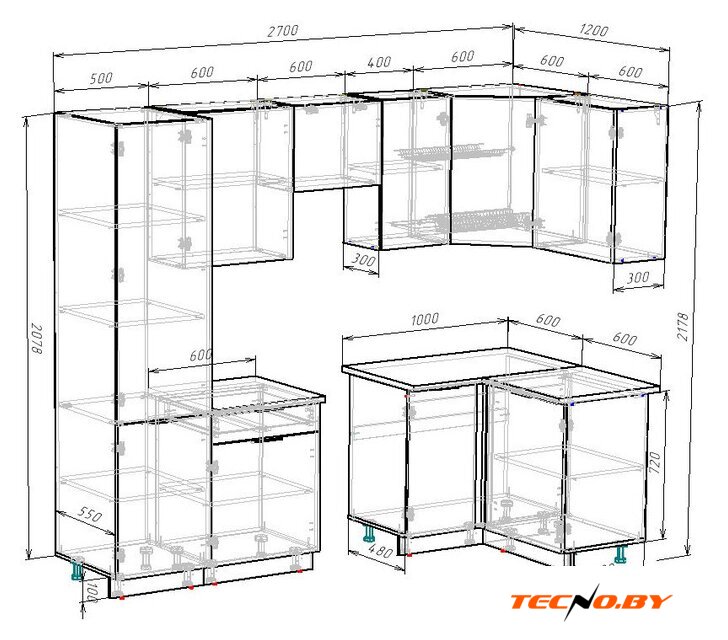 угловая, длина 260 см, ширина 168 см, каркас ЛДСП, фасад ЛДСП, установка мойки: врезная мойка, ширина шкафа под мойку 98 см
