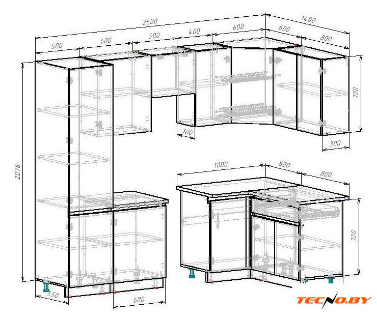 угловая, длина 260 см, ширина 140 см, каркас ЛДСП, фасад ЛДСП, установка мойки: врезная мойка, ширина шкафа под мойку 96 см