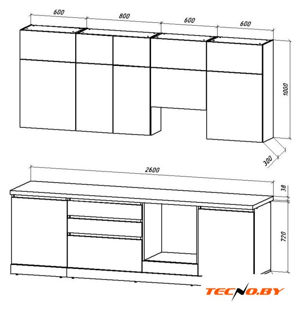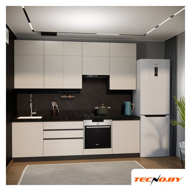 линейная, длина 290 см, ширина 60 см, каркас ЛДСП, фасад МДФ пленочный, установка мойки: врезная мойка, ширина шкафа под мойку 60 см