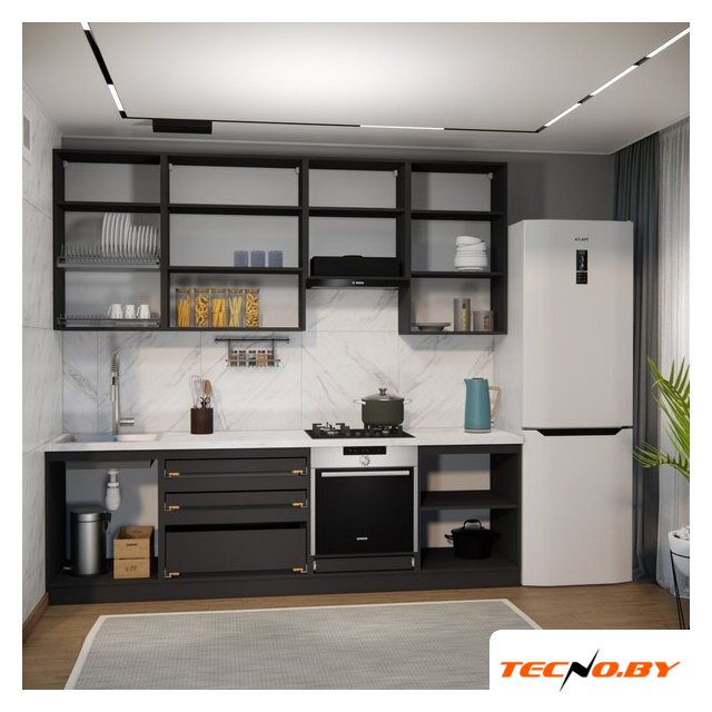 линейная, длина 270 см, ширина 60 см, каркас ЛДСП, фасад стекло/МДФ пленочный, установка мойки: врезная мойка, ширина шкафа под мойку 60 см