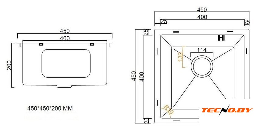 врезная под столешницу, нержавеющая сталь, размеры: 45x45 см