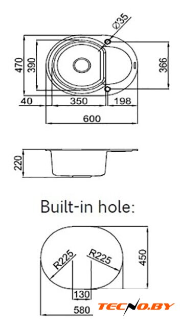 врезная на столешницу, искусственный камень, размеры: 60x47 см, в шкаф 45 см