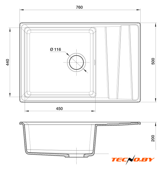 врезная на столешницу, искусственный камень, размеры: 76x50 см, в шкаф 60 см