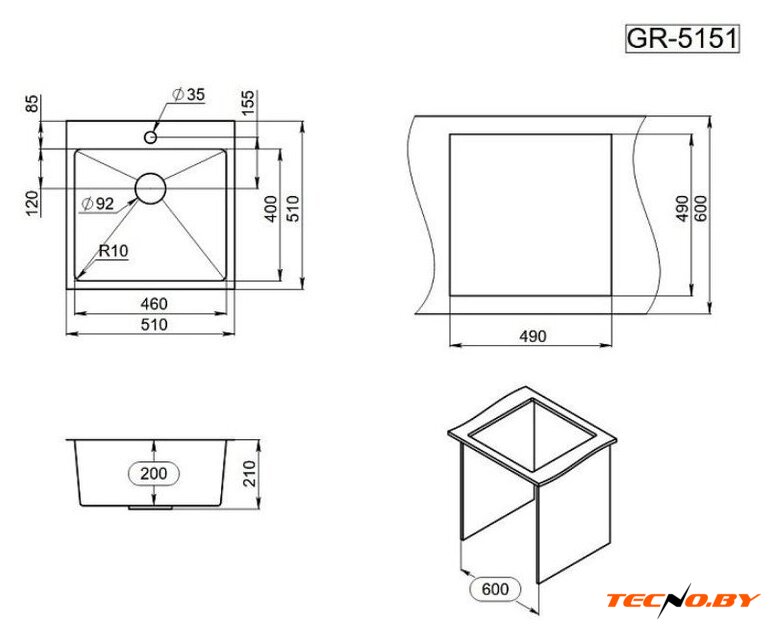 врезная на столешницу, искусственный камень, размеры: 51x50 см, глубина чаши: 24.5 см, в шкаф шириной от 50 см