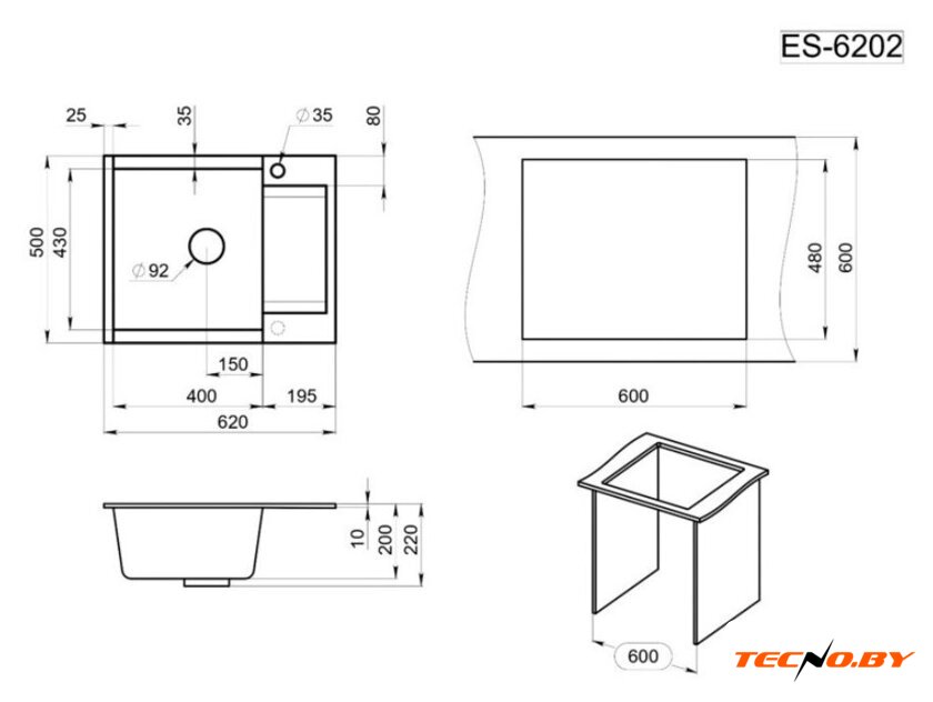 врезная на столешницу, искусственный камень, размеры: 50x62 см, в шкаф 60 см