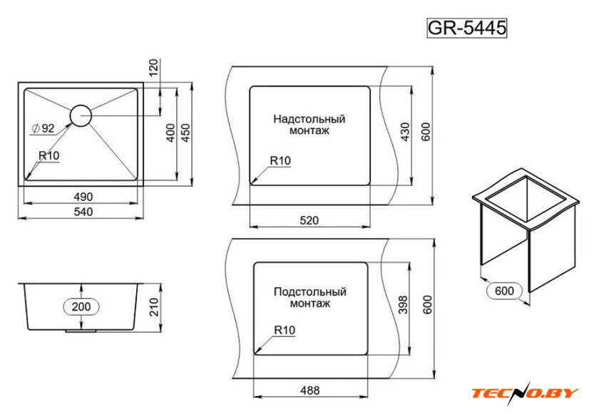 врезная под столешницу, искусственный камень, размеры: 54x42 см, глубина чаши: 21.7 см, в шкаф шириной от 60 см