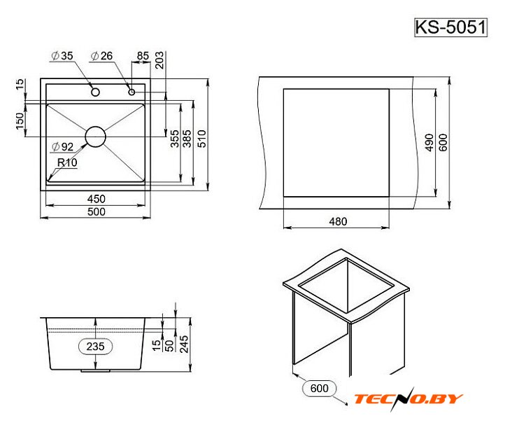 врезная на столешницу, искусственный камень, размеры: 100x51.5 см, глубина чаши: 21 см, в шкаф шириной от 60 см