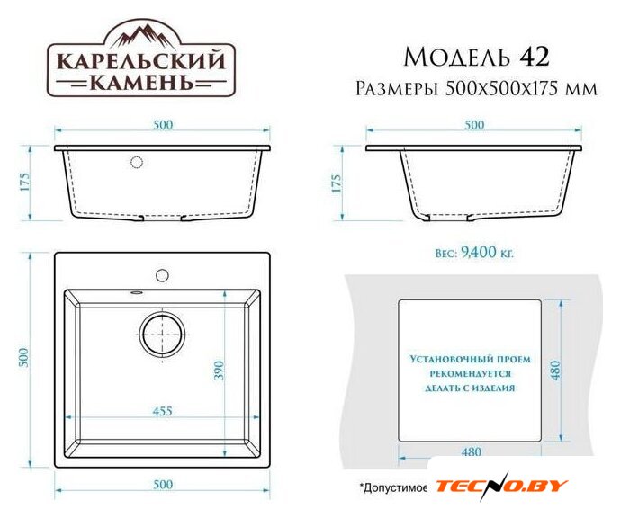 врезная на столешницу, искусственный камень, размеры: 48x44 см, глубина чаши: 16 см, в шкаф шириной от 50 см